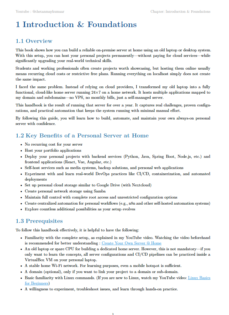 This book shows how you can build a reliable on-premise server at home using an old laptop or desktop system. With this setup, you can host your personal projects permanently—without paying for cloud services—while significantly upgrading your real-world technical skills.